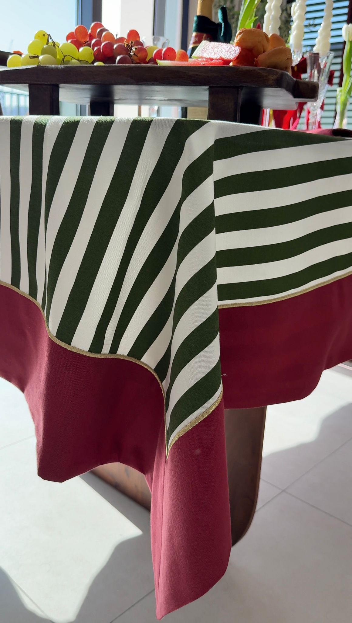 Rouge Elegance Yeşil Beyaz Çizgili ve Kırmızı Bordürlü Altın Renk İşlemeli Masa Örtüsü 260 x 160 cm